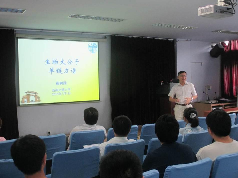 师生作了一场题为“生物大分子单链力谱”的学术报告。报告会由轻纺与食品学院院长何有节教授致欢迎辞,生物质与皮革工程系副系主任林炜教授主持。崔树勋教授在报告中介绍了该课题组近几年利用原子力显微镜的单分子力谱方法,在单分子层次上研究不同溶剂环境对单(双)链DNA和多聚蛋白自组装行为影响的最新研究进展。崔树勋教授的报告图文并茂,内容新颖、详实,讲解深入浅出。报告结束后,崔树勋教授与学院部分师生进行了交流和讨论。崔树勋教授现任职于西南交通大学教授。1995年--2004年在吉林大学求学,先后获学士和博士学位。曾在慕尼黑大学和UC Berkeley从事合作研究。研究兴趣为聚合物纳米力学探测和生命起源及分子进化。先后主持国家自然科学基金项目6项。已在J. Am. Chem. Soc.、Nano Letters、Macromolecules等国际知名期刊发表SCI研究论文40多篇,论文被他人SCI引用460次。2008年荣获中国化学会“青年化学奖”。2011年入选教育部新世纪优秀人才支持计划。2012年获国家自然科学基金委优秀青年科学基金资助。