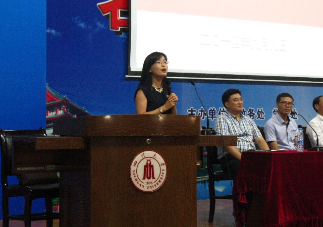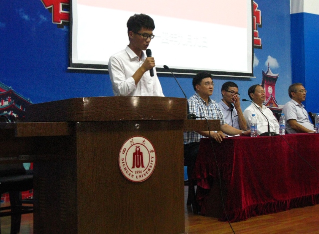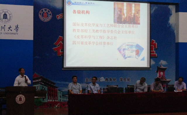 江安校区水上报告厅隆重举行。出席本次开学典礼的有学院党委赵毅书记,院长何有节教授,院党委副书记刘晓虎副教授,副院长兰建武教授,副院长何强教授,轻化工程专业2005届校友唐志海先生,教师代表杨璐铭老师,2014级辅导员李晓秀老师和向星烨老师。高年级学生代表程天鹏同学以及全体2014级同学参加了本次活动。开学典礼由党委副书记刘晓虎副教授主持。首先,赵毅书记发表了热情洋溢的致辞。他着重就能力培养、习惯养成、性格塑造等五个方面对新生同学提出了殷切的期望,并勉励大学生应学会学习和思考,为新生未来的发展指明了奋斗方向。何有节院长全面介绍了轻纺与食品AV研究所概况