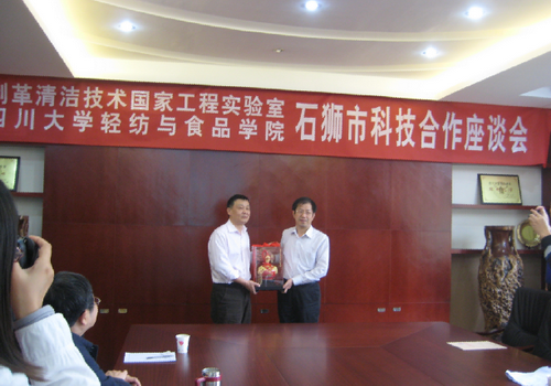 会后,与会三方互赠了纪念品。何院长陪同石狮市领导参观了制革清洁技术国家工程实验室、生物质皮革工程系展览室、皮革系校内实习基地等。