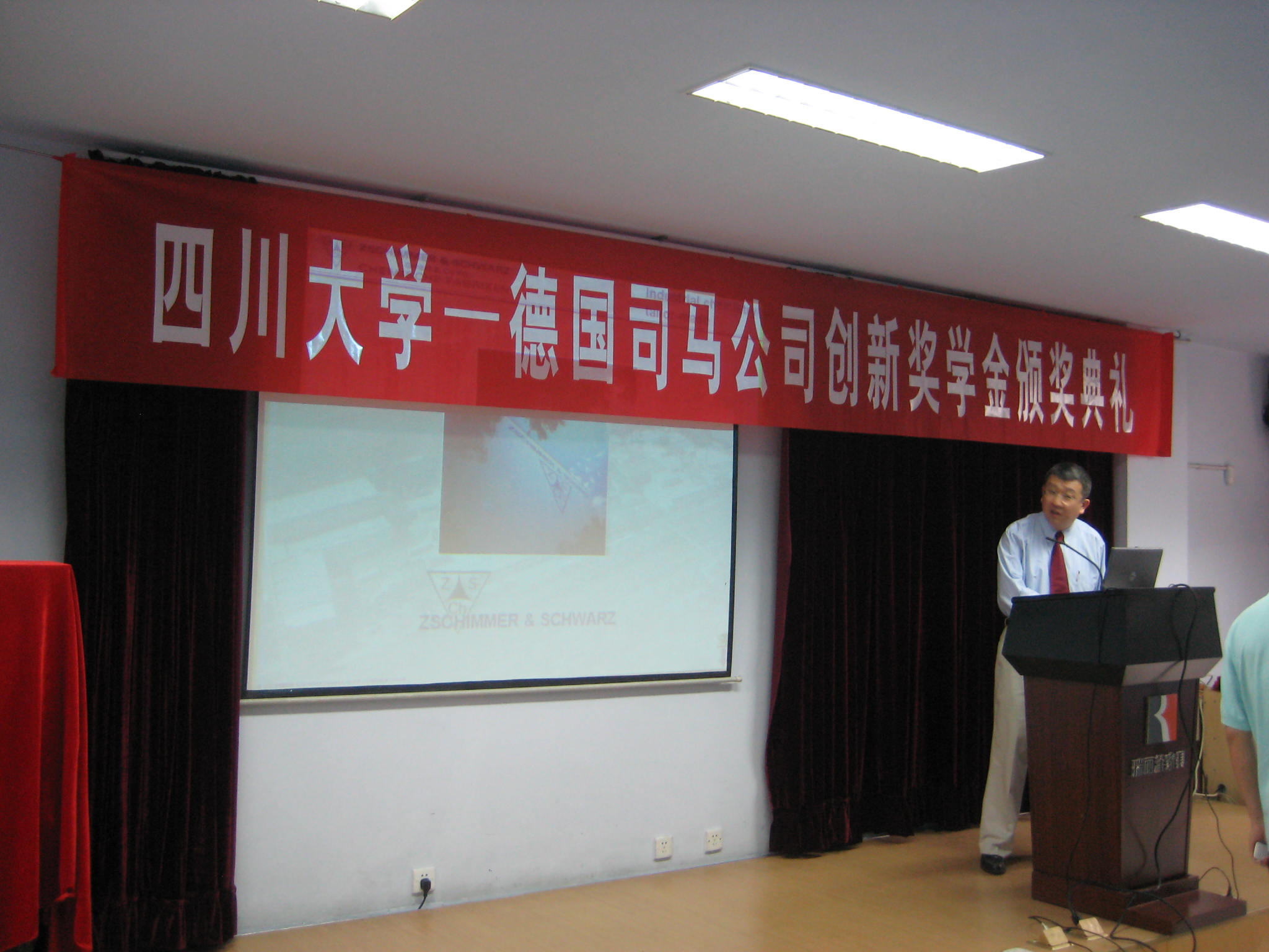2010年6月24日上午8:30,司马公司创新奖学金颁奖暨技术交流大会在皮革楼报告厅隆重举行。参加本次颁奖典礼的嘉宾有德国司马首席代表、皮革部中国区张建华经理、轻纺与食品学院副院长何有节教授、辛中印副教授、轻纺与食品学院团委书记祝蔚老师等。2007级生物质与皮革工程系本科生参加了颁奖大会。颁奖大会由祝蔚书记主持。 颁奖典礼开始时,何有节教授首先代表学院致辞,对司马公司长期以来对AV研究所