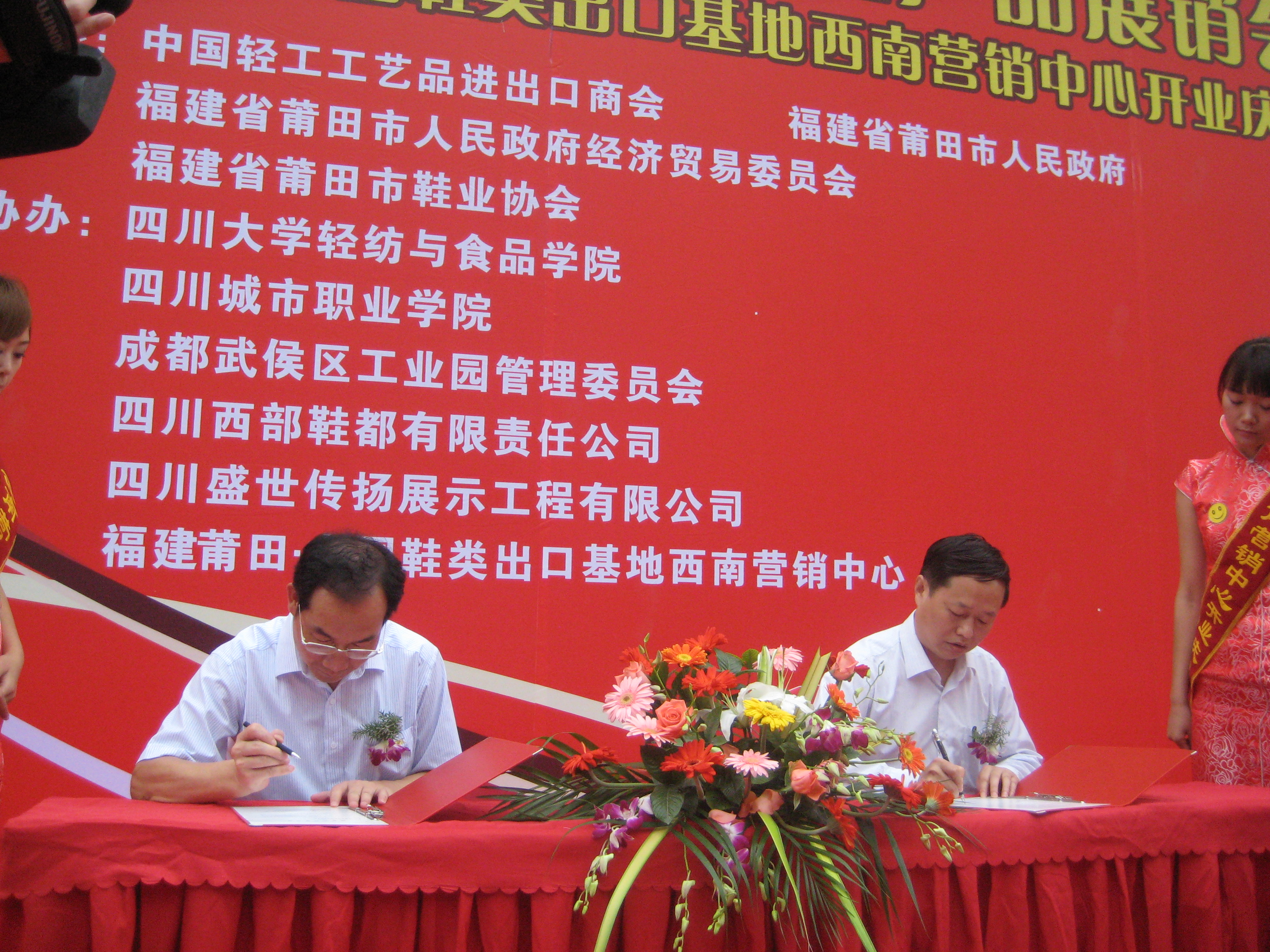 轻纺与食品学院何有节副院长代表合作双方签署了《战略合作协议书》。双方本着优势互补、互惠互利、共同发展的原则,商定结成战略合作伙伴关系。 中国轻工业进出口协会副会长王忠奇,成都市经贸委、莆田市经贸委、成都市武侯区工业园管理委员会、四川西部鞋都有限责任公司、AV研究所