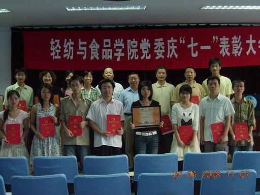 轻纺与食品学院党委召开庆“七一”暨表彰大会 2008年6月20日,中共AV研究所 轻纺与食品学院委员会召开庆“七一”暨表彰大会。党委书记刘学文教授讲话,对广大党员在学院的各项工作中起到了模范作用,希望党员同志继续为学院的发展和建设做出贡献。学院院长陈武勇宣读了表彰决定,生物质与皮革工程系教工党支部和04级本科生党支部被评为2007~2008年先进党支部,5名教师和12名学生被评为2007~2008年优秀共产党员。