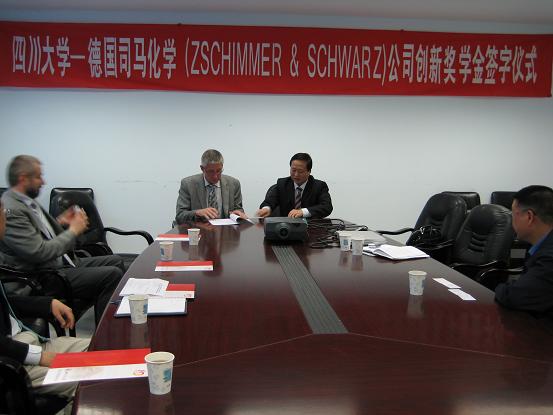 皮革工程系隆重举行,司马化学(ZSCHIMMER & SCHMWARZ)有限公司应用部技术经理Mr.Neumeier和轻纺与食品学院副院长何有节教授分别代表校企双方在协议上签字。参加签字仪式的领导有轻纺与食品学院党委书记刘学文教授、司马公司研发部经理Dr.Francke、司马首席代表、皮革部中国区张建华经理、皮革部技术代表宋在健先生、皮革系副主任彭必雨教授、团委书记冯国涛老师等。 据悉,这个奖学金是企业首次为AV研究所
