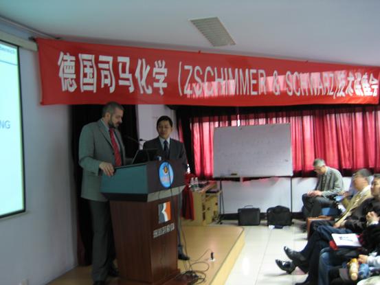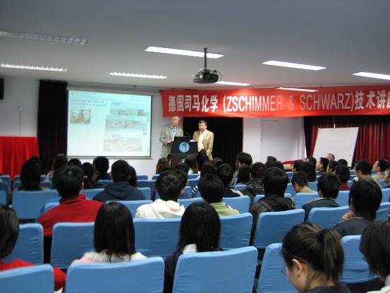 轻纺与食品学院皮革工程系,并于2008年3月29日上午在皮革工程系报告厅为本科生、研究生举行专场技术报告会。参加本次报告会的有轻纺与食品学院副院长何有节教授、04级辅导员刘健西老师以及轻化工程本科生、研究生共100余人。报告会由何有节教授主持。 Mr. Neumeier首先就德国司马化学有限公司的创立、发展及主要产品给大家作了详细的介绍。Dr.Francke 作了题为Introducing of ZSCHIMMER & SCHWARZ Fatliquoring Agents的报告,对该公司的加脂剂及其他产品的性能、应用做了详细的介绍,并展示了该公司生产的汽车坐垫革,引起了同学们的浓厚兴趣。报告会结束以后, Mr.Neumeier、Dr.Francke、张建华先生等就汽车坐垫革的制革工艺,制革工艺中的环保问题等同学们非常关心的问题进行了详细的交流,同学们提问积极踊跃,现场气氛十分活跃。 德国司马化学有限公司成立于1894年,总部位于德国莱恩斯坦市,公司一直致力于皮革化学品、毛皮化学品、陶瓷化学品、化纤化学品以及各种表面活性剂的开发研究,公司有超过三分之二的销售额来自国外业务。与此同时,公司有自己的一套完备的废水净化设备和技术,履行对环境保护的承诺。