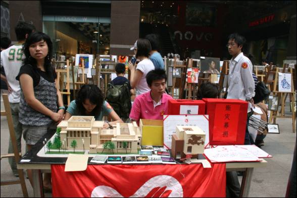 同学,建筑与环境学院、艺术学院的同学们也非常踊跃地拿出平时珍藏的优秀作品,短短几个小时内就组织到265件作品。 师生们为本次义卖活动捐出了各类自己制作的艺术品,有油画、国画、服装效果图、素描、钢笔风景画、工艺挂毯、蜀锦、剪纸、建筑模型、手工坐椅板凳等。本次义卖活动既是同学们回报社会为灾区人民做贡献的爱心行动,也是一次生动的社会实践活动。把在编导课上学习的策划和组织方法,运用到现实中的实战策划与实现过程;同时在义卖活动中同学们学习观察到哪类作品,哪种风格的作品会受到市民的喜爱;在现场义卖中,同学热情的向市民介绍我们这次活动的背景意义,详细介绍作品的艺术性与工艺特点,踊现出具有良好口才的推销好手。在拍卖现场,同学们的服装效果图与工艺挂毯都取得了较好的拍卖效果,其中赵敏老师捐出的蜀绣作品拍得全场的最高价2008元。 本次义卖活动得到了校院的大力支持,院学生工作组为这次义卖活动出资1千5百多元用于绘画作品的装裱、画架作品运输。5月25日下午我校团委书记王斌老师与院党委刘晓虎副书记亲自来到作品拍卖现场为同学们加油鼓劲,王斌书记还现场购买了一幅学生绘制的服装效果图以示支持。这次义卖活动得到了全院同学的积极响应,作品现场组织与义卖管理虽然主要来自于服装设计与纺织工程专业师生,但轻化工程与食品专业的志愿者同学也相当热情,很多同学主动打来电话,愿意为本次义卖活动作志愿者,为灾区人民尽点力,做点事。 当全国人民为地震灾区慷慨解囊,纷纷无偿来到灾区做志愿者,告诉灾区人民:在这一刻,我们是四川人,我们是汶川人时,我们深受感动。我们川大与川师的学子,希望通过我们的努力代表四川高校的师生,告诉灾区的人民与学童: 不离弃,不放弃, 我们的心在一起,我们一直在支持你!