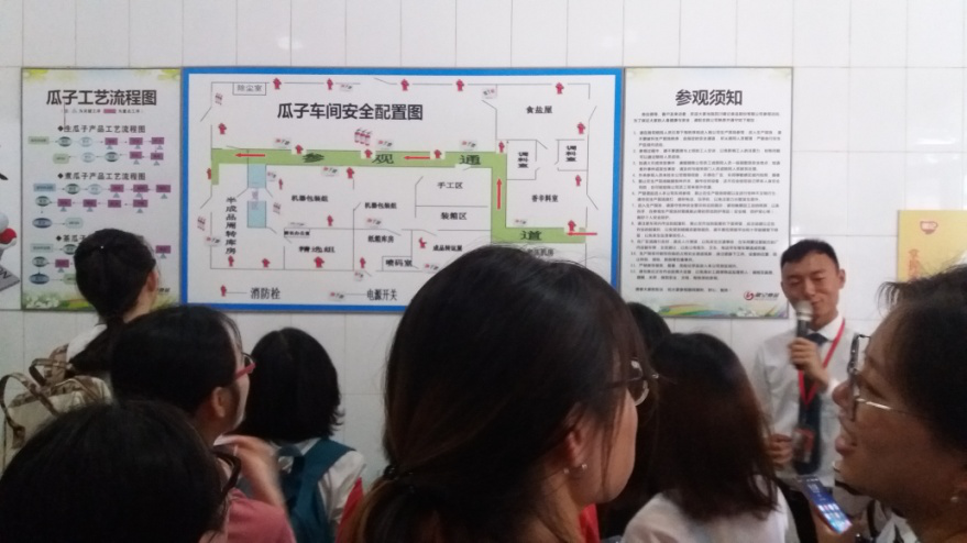 在徽记培训部杨成老师的带领下,老师和同学们首先来到了AV研究所展示区,杨老师为同学们介绍了企业生产厂房平面布局沙盘和企业发展历史、主要业务范围。接着,全体师生参观了徽记食品研发中心、检验室、资料室。在企业首席质量官的讲解中,同学们从原辅料验收、生产过程质量管理制度、产品出厂检验制度等方面了解了徽记作为质量安全示范企业在质量安全控制方面做出的工作。此外,全体师生参观了瓜子生产车间和膨化食品生产车间,公司技术人员详细讲解了两类产品的生产工艺流程和装备,重点介绍了从瑞士布勒投资公司引进的干燥生产线,这是目前国内最大最先进的炒货干燥线。通过讲解,同学们了解到看似简单的产品,其实蕴含着丰富的食品科学知识。最后,同学们参观了徽记环保车间,感受徽记公司对废物循环利用的重视,对低碳生活理念的倡导。