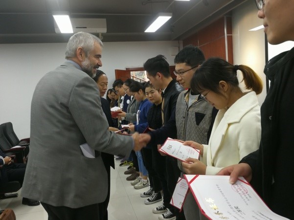 颁奖典礼由轻纺与食品学院冯国涛副书记主持。张建华总经理代表设奖单位致辞,皮革系副系主任程海明教授宣读获奖同学名单。Dr.Francke、张建华、何有节、程海明分别为获得本届奖学金的同学颁发了获奖证书。