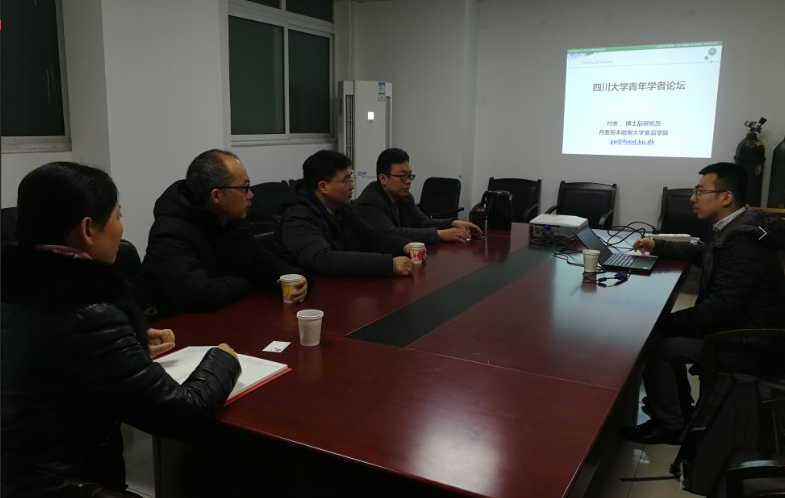 2018年12月19日,轻纺与食品学院刘晓虎书记、何强副院长、食品系主任吕远平教授、副主任迟原龙副教授在纺工楼会议室与丹麦哥本哈根大学付余博士进行交流座谈。座谈会上刘晓虎书记首先对付余博士的到访表示了欢迎,然后对AV研究所