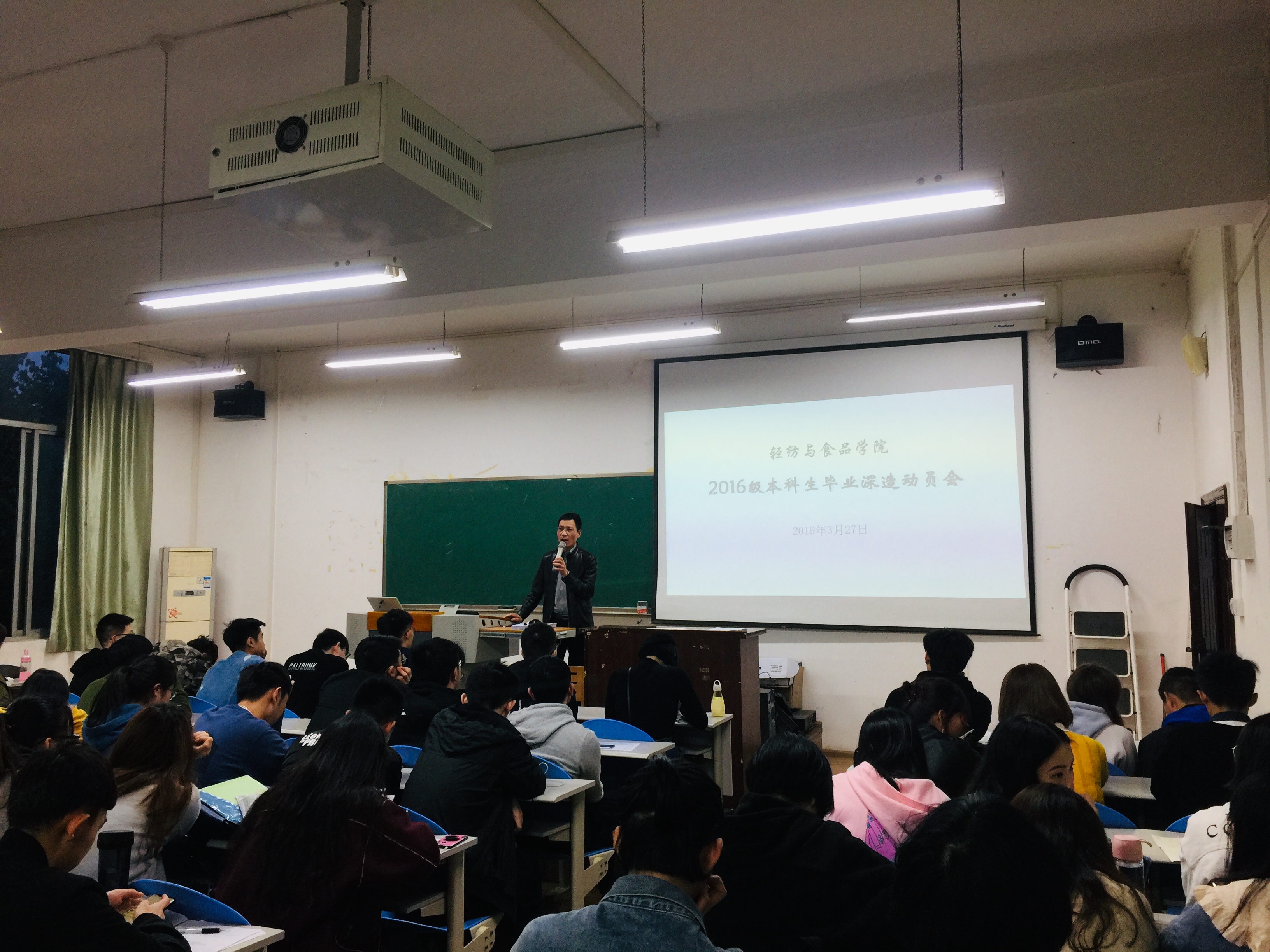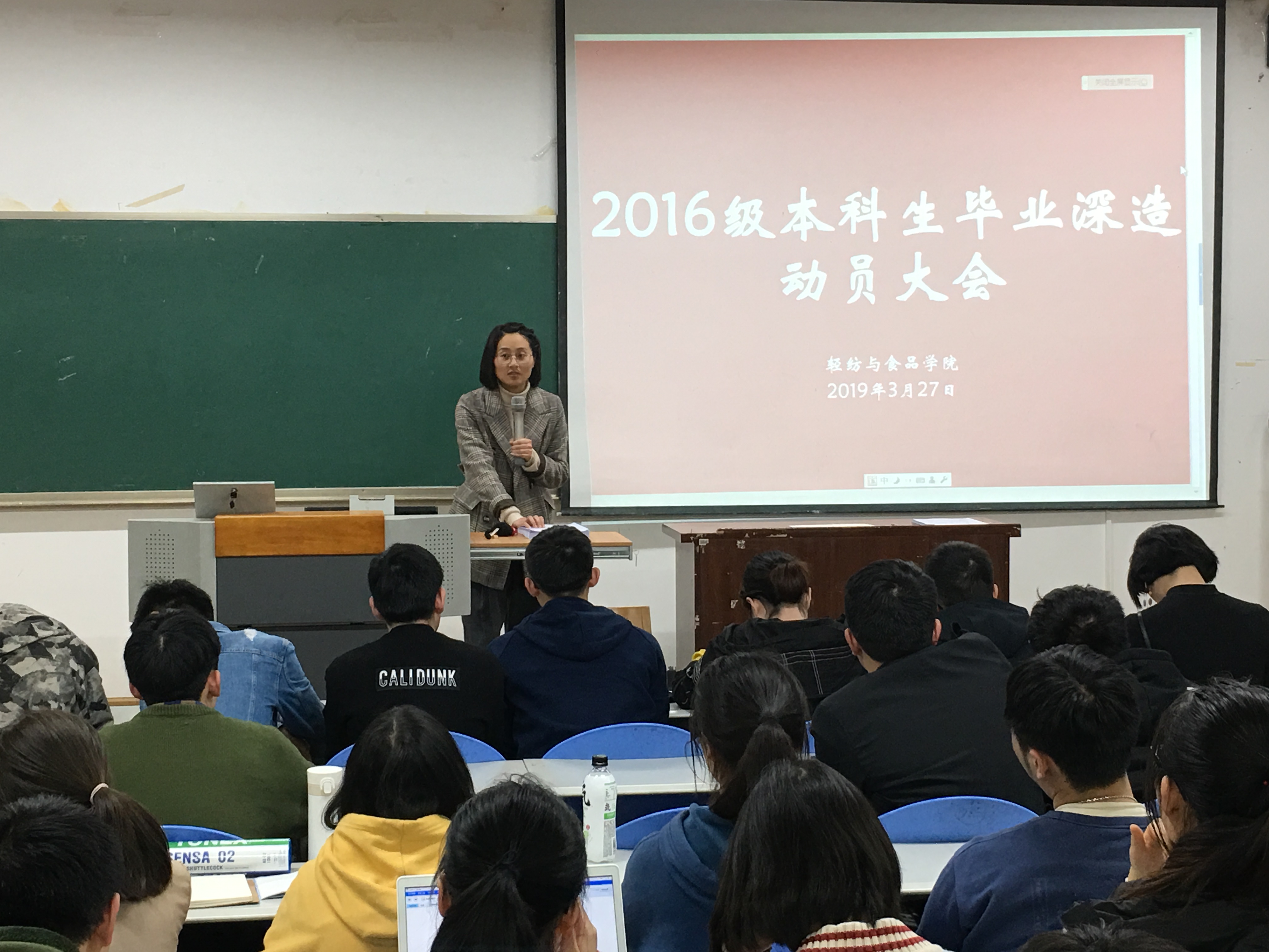 于2019年3月27日晚19时在纺工附楼205教室举行了2016级本科生深造动员大会。本次深造动员大会由轻纺与食品学院党委副书记冯国涛老师主讲,2016级本科生辅导员王舒灏老师以及2016级全体学生到场参加了动员大会。