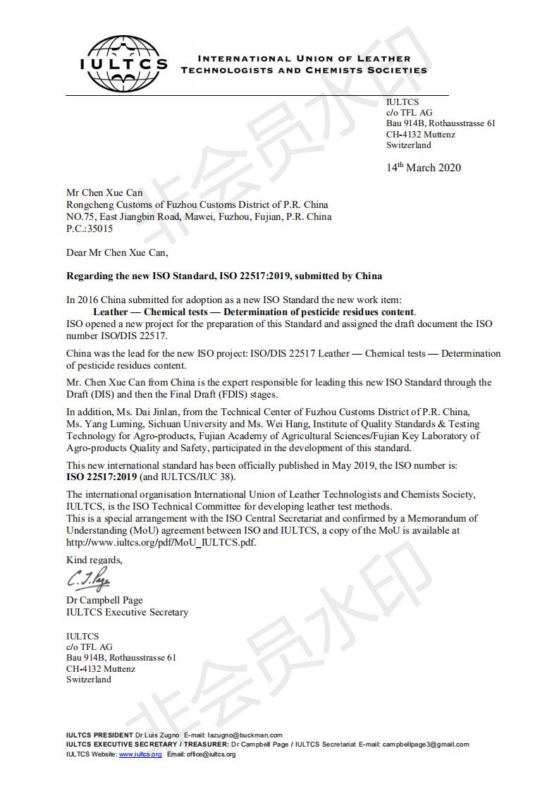 杨璐铭副教授参与制订的国际标准《皮革 化学试验 农药残留检测方法》由ISO和国际皮革化学家和工艺师协会联合会(以下简称:IULTCS)批准正式发布。该国际标准项目于2015年10月获得IULTCS立项,2017年2月再获ISO立项,是ISO和IULTCS共同立项、平行开展的国际标准化项目,带有ISO和IULTCS两个机构的双重标准标识和编号,标准编号分别为:ISO 22517:2019和IULTCS/IUC 38:2019。