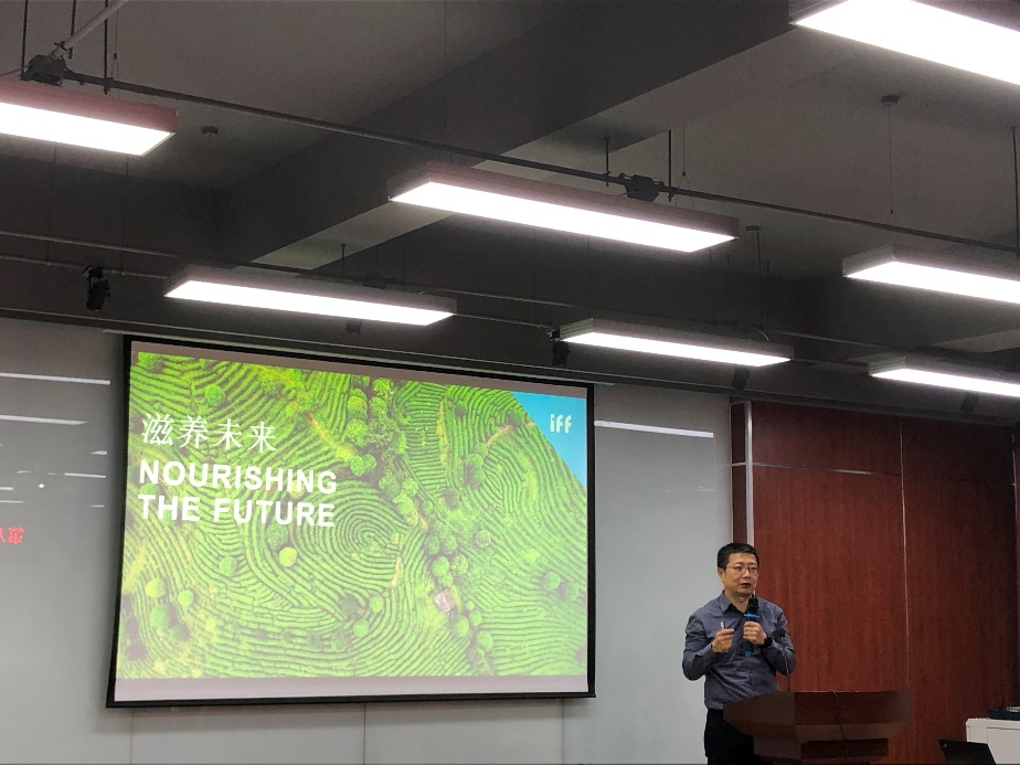 IFF营养与生物科技菌种应用专家王德纯先生对IFF企业情况进行介绍。王老师以“滋养未来”作为本次宣讲的主题,从IFF的发展历程、Nourish业务概要、IFF产品组合以及IFF三大创新主题等方面进行了讲述,为师生们传递了IFF的企业文化以及创新理念�