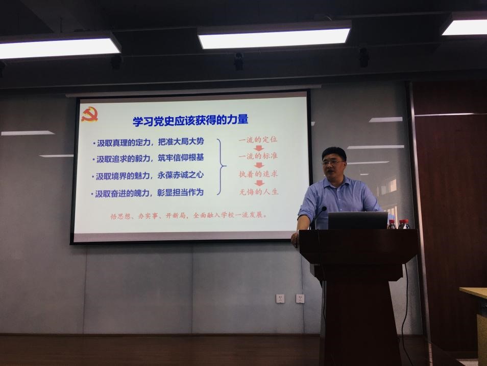 刘晓虎书记在专题党课中,从“中国共产党为什么能”、“马克思主义为什么行”、“中国特色社会主义为什么好”、“学习党史应该获得的力量”等四个部分,结合个人学习感悟和深刻理解,向学院教职工全面阐释:是历史和人民选择了中国共产党;中国共产党带领中国人民从胜利走向新胜利是党性使然,更是历史必然;只有马克思主义才能救中国,只有中国特色社会主义才能发展中国;我们必须汲取真理的定力、追求的毅力、境界的魅力、奋进的魄力,做到把准大局大势、筑牢信仰根基、永葆赤诚之心、彰显担当作为。刘晓虎书记指出学院将以习近平新时代中国特色社会主义思想为指导,围绕校院“十四五”发展规划和世界一流大学建设目标,紧扣立德树人根本任务,坚持高质量、内涵式发展,努力推进实现“两个伟大”宏伟目标。