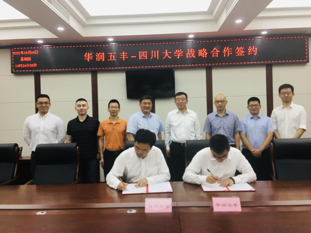 2021�9�9日上午,华润五丰集团党委书记、总经理于舒天带领集团战略发展部副总经理兼五丰黎红党委书记、总经理刘宜朋、华润五丰集团战略发展部高级经理吴野牧、五丰黎红公司第一党支部书记、研发总监幸勇到校考察交流�四川大学科学技术发展研究院科技合作与技术转移部副部长高德友、四川大学轻工科学与工程学院党委书记刘晓虎、副院长何强、副院长肖凯、食品工程系赵志峰副教授等在纺工附楼205会议室参加本次交流会。会议由何强副院长主持�