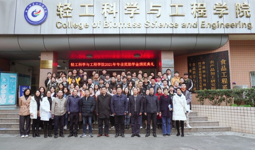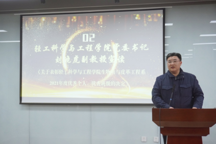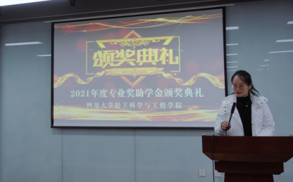 2021年度优秀个人、优秀班级的决定》。在隆重的颁奖音乐中,学院领导为获奖同学代表一一颁奖并合影留念。最后,2019级轻化工程专业创新班学生孙楠同学代表获奖学生发言,他表示在学习阶段对皮革专业了解越多,热爱越深,学院提供了优秀教师资源与超一流实验室,而学生要做的就是把握机会,在入学的这3年里他找到了自己的科研方向、制定了清晰的计划。同时,他也表达了对设奖单位的感谢,对学院老师们的谆谆教导表示谢意。最后他感悟到现如今多学科交叉是大学期间综合能力提升的必然趋势,应积极拓展自我视野和知识面,而学习之路没有捷径,继续深造应是作为川大本科毕业生的首要选择,也是自我前进路上的风景!