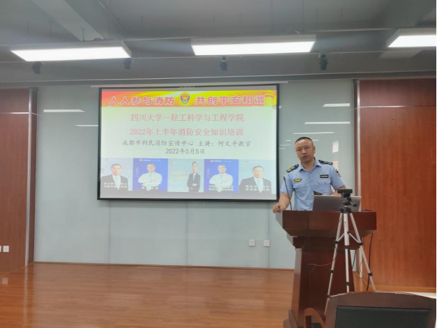 为进一步增强全院师生消防安全意识,明确消防安全责任与强化消防安全技能,2022年5月5日上午,学院邀请了成都市利民消防宣传中心何文平教官在皮革楼215报告厅为全院师生开展了消防安全知识培训主题活动。因疫情防控需要,学院班子成员、全体教职工与全体研究生以线上线下结合的方式参加了培训,本次培训会由学院分管安全工作的周建飞副院长主持。