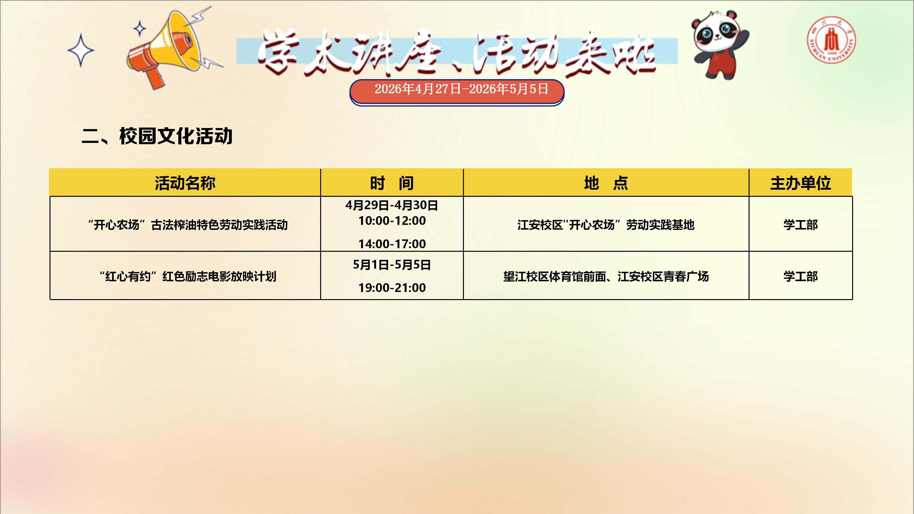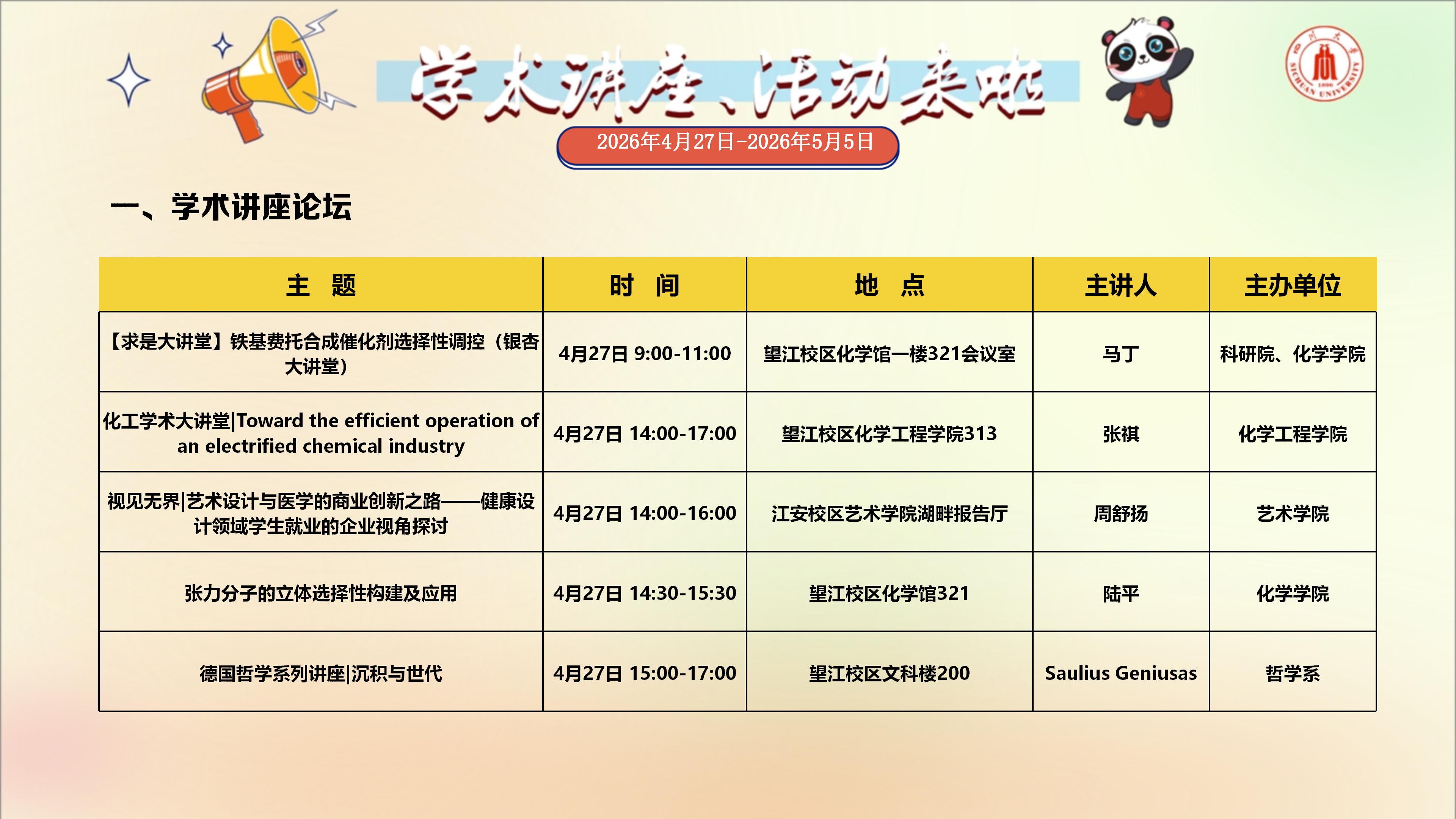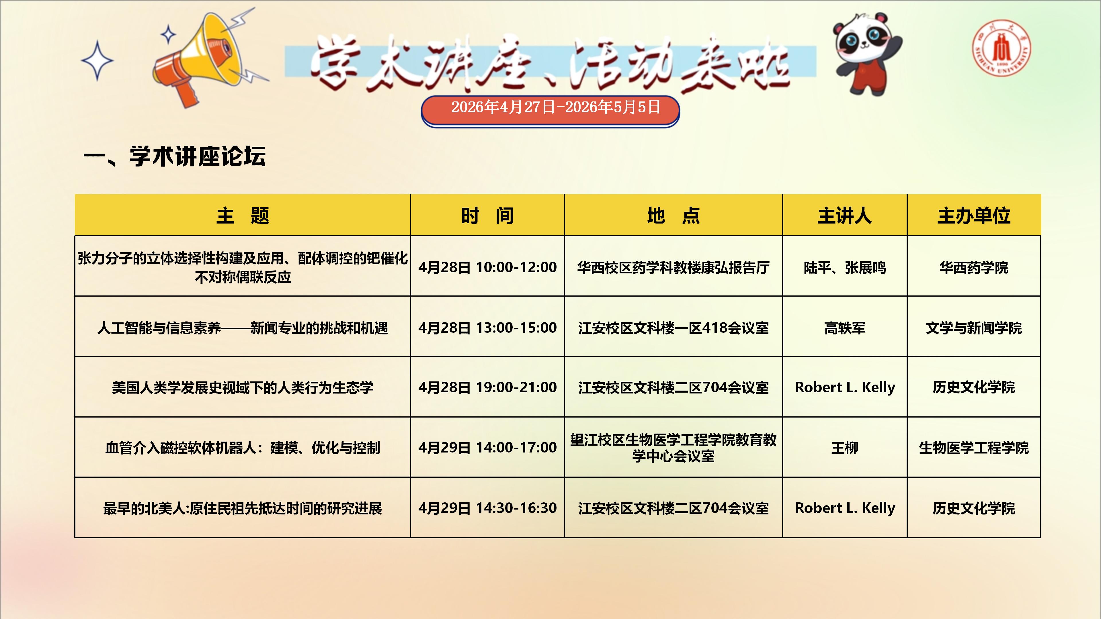 学术讲座与校园文化活动预告(2026年4月27日-2026年5月5日)