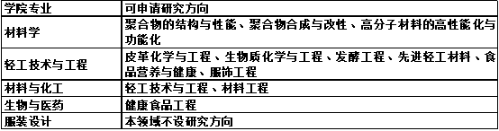 学院当前设有轻工类含轻化工程专业、食品科学与工程专业、生物工程(轻工生物)专业、服装与服饰设计4个本科专业。拥有材料学、轻工技术与工程、服装设计共3个学术型硕士学位授权点,有材料与化工、生物与医药共2个专业型硕士学位授权点。有材料学和轻工技术与工程2个科学博士学位授权点、材料与化工和生物与医药2个工程博士学位授权点及博士后流动站2个。
