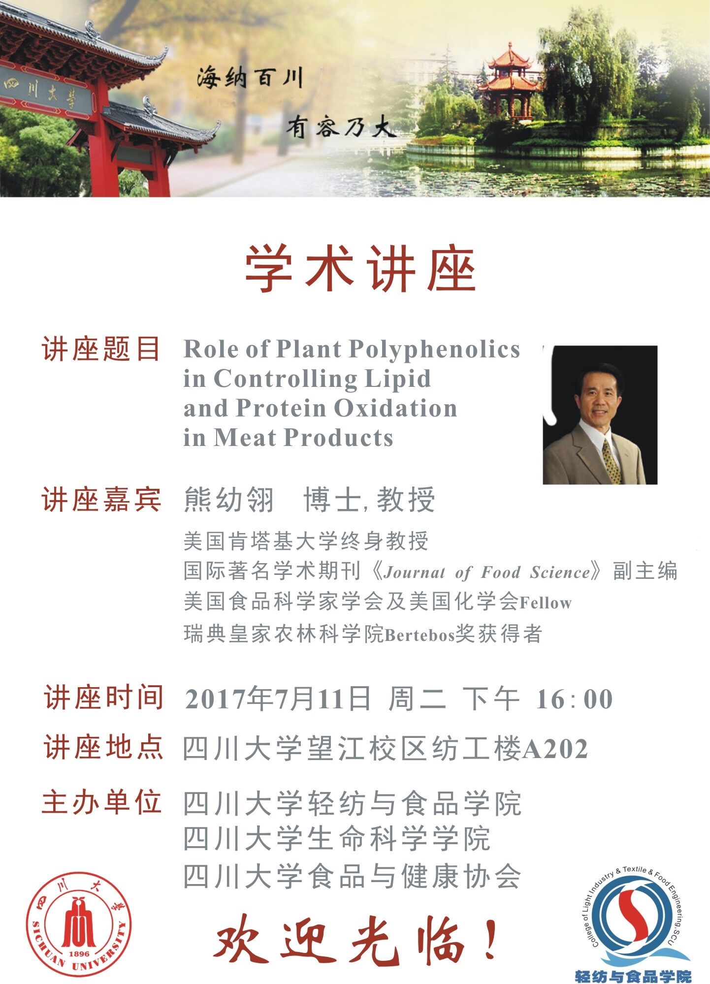 报告题目:Role of Plant Polyphenolics in Controlling Lipid and Protein Oxidation in Meat Products 报告人:美国肯塔基大学熊幼翎博士教授 报告时间:2017年7月11日(星期二)下午16:00 报告地点:AV研究所
