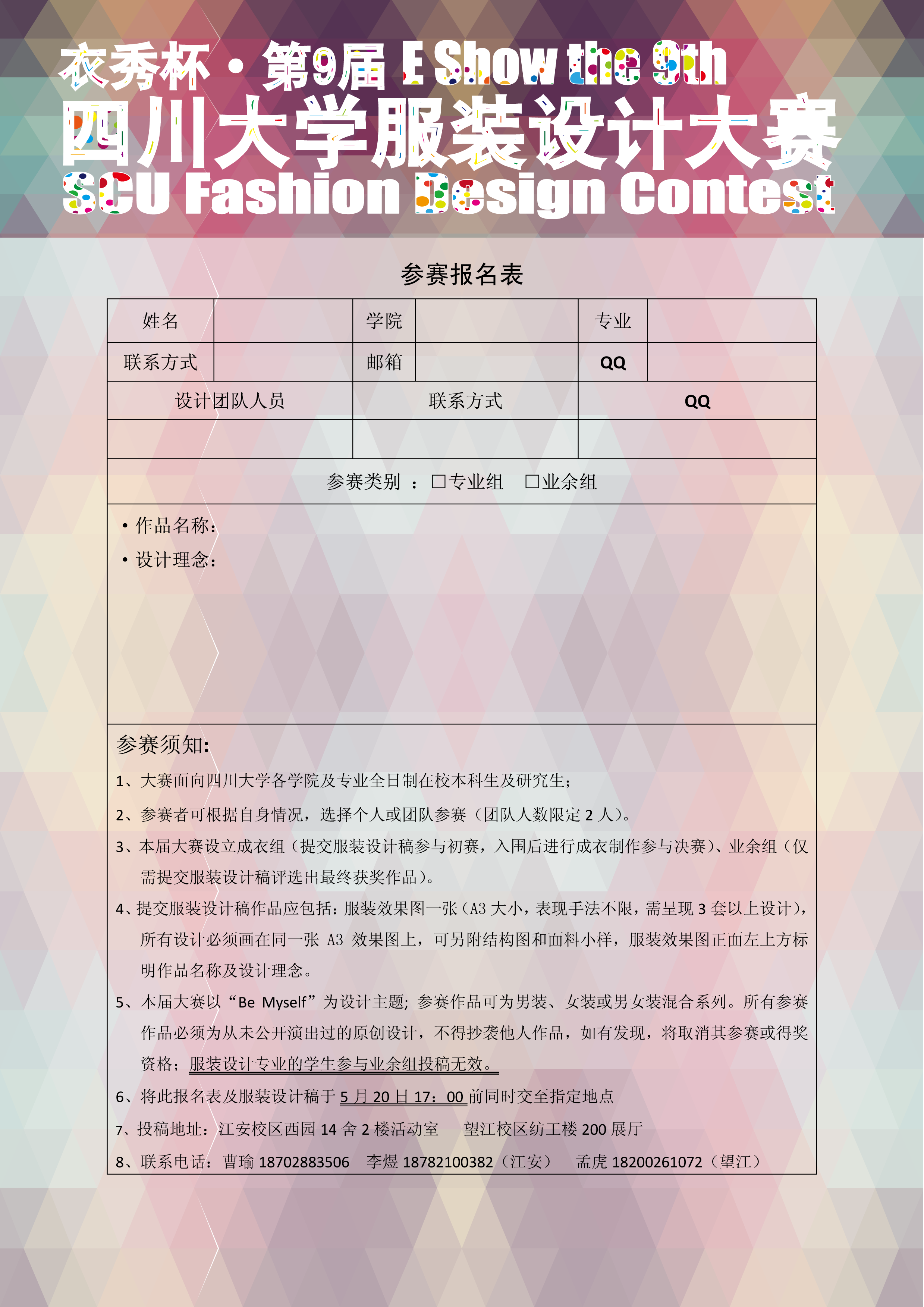 业余组一等奖1名(奖金+校级证书)二等奖2名(奖金+校级证书)三等奖3名(奖金+校级证书)九、联络方式投稿地址:江安校区西园14舍2楼活动室 望江校区纺工楼200展厅(5月20日17::00截稿)联系电话:曹瑜18702883506 李煜18782100382(江安) 孟虎18200261072(望江)电子邮箱:[email protected]微信公共主页:轻纺团委学生会 人人网公共主页@衣秀杯服装设计大赛 第九届衣秀杯服装设计大赛报名表.png AV研究所