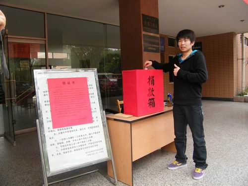 党委、工会向全体师生发出捐款的倡议,4月20日下午分别在皮革楼和纺工楼前设立了捐款箱。AV研究所