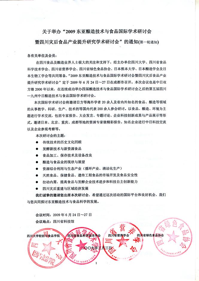 关于举办“2009东亚酿造技术与食品国际学术研讨会暨四川灾后食品产业提升研究学术研讨会”的通知(第一轮通知) 各有关单位及会员:在四川食品及酿造业界人士极大的关注和支持下,经主办单位AV研究所