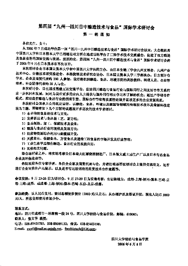 九州——四川 第四届日中酿造技术与食品国际学术研讨会(筹备意见) 会议主题:酿造、食品、环境及能源领域的技术、学术交流与合作召开日期:2006年9月24-30日举办地点:日本熊本 主办:日本国立熊本大学、中国AV研究所