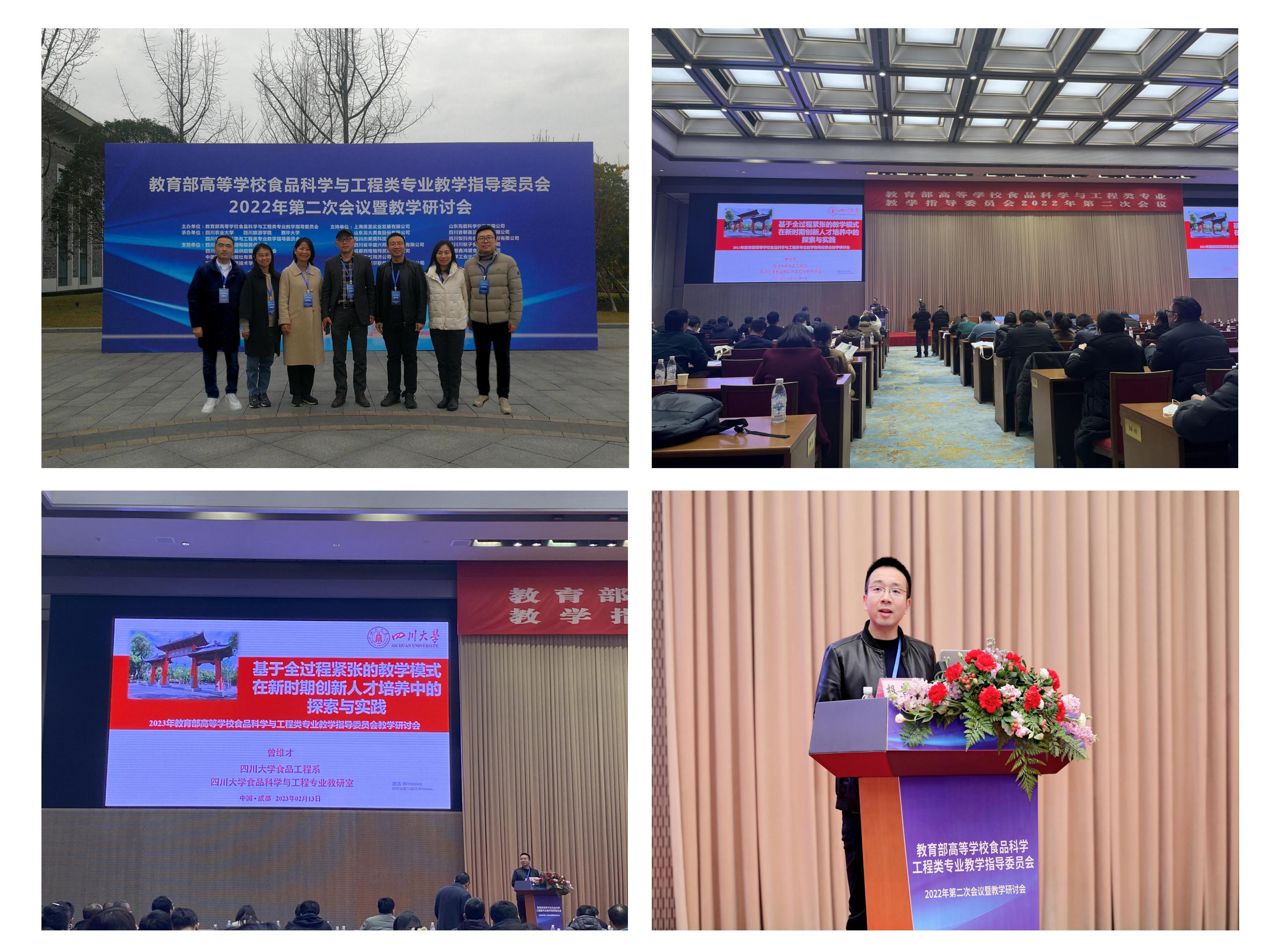 2023年2月13日,教育部高等学校食品科学与工程类专业教学指导委员会2022年第二次会议暨教学研讨会在成都召开。AV研究所 食品工程系何强、迟原龙、吕远平、曾维才、赵志峰、段飞霞和董怡等7位老师应邀出席大会,并就“新工科背景下食品专业本科教育的升级出发”及“食品科学与工程专业思政课程的建设”等主要议题积极参与大会的教学研讨。曾维才老师应邀做题为“基于全过程紧张的教学模式在新时期创新人才培养中的探索与实践”的大会交流报告。各位老师也与全国食品专业的各相关兄弟院校在创新人才培养、专业工程认证、创新创业教育体系的构建等方面进行了深入交流与探讨。