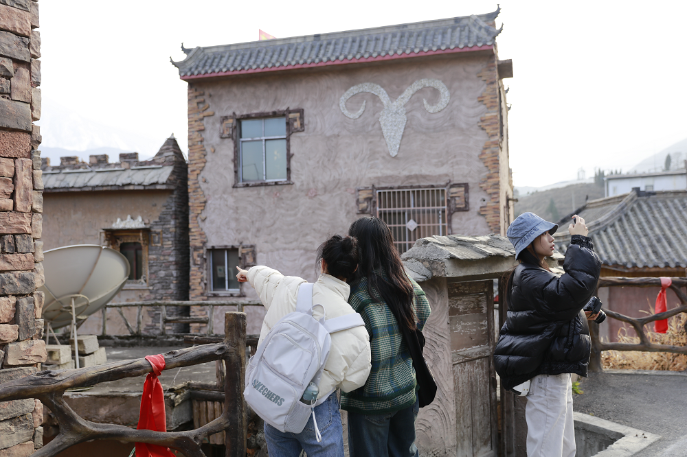 采风团的第一站是到坪头羌寨进行沉浸式体验。坪头羌寨位于岷江上游、茂县县城西南岸的台地上,海�1688米。村容村貌和村民习俗透出古朴而浓郁的羌风。其建筑充分体现了羌族“依山居止”的传统,灰墙白顶、黄泥片石、房顶的羊角和白石头、窗户的羊头雕花等鲜明的文化特征。村庄内,流水潺潺、小巷通幽,栈道连接着房前屋后。初春之际,房前屋后的田野上,樱桃树、李树、苹果树、梨树等孕育着嫩芽,可以想象坪头羌寨花开时节“房子建在花中,花丛裹着房子,风儿吹来凉爽,溪水流躺柔情”宛若桃源的美景�