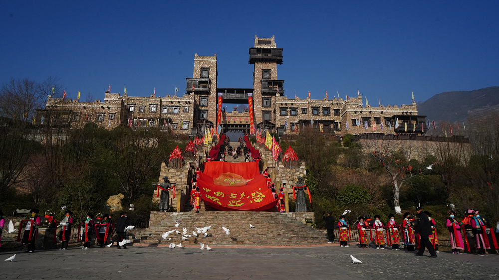 翌日清晨,采风团一行来到了规模宏大、气势雄伟的中国古羌城。中国古羌城延续着羌族传统碉楼建筑风格,是全国规模最大、功能齐全、设施完善的羌文化核心展示地。每天早�9时许,中国古羌城都会举行开城仪式,身着民族盛装的羌族群众跳起欢快的沙朗,“释比”引领队伍拾阶而上,随着二十米高的巨型古羌城门徐徐打开,羌王羌后率领护卫、羌族姑娘出城,身着盛装的羌族姑娘双手托举着羌红走下台阶,迎接远道而来的客人,让观众感受古代羌王迎接贵客的仪式感。羌族被称为“云朵上的民族”,羌绣、羌笛、羊皮鼓舞、多声部民歌、瓦尔俄足节等非遗文化,蕴含着浓郁的生活气息和民族记忆,令师生们不禁称赞�