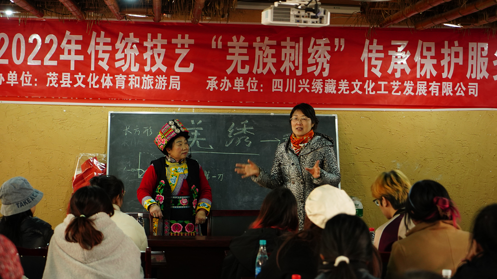 在古羌城内,还坐落着茂县非物质文化遗产传习中心,这里聚集了传统技艺、传统音乐、传统体育竞技游艺、传统医药、民间文学、民间美术等多种门类的非遗项目。通过邀请相关非遗项目传承人进驻传习中心,形成了一个集非遗展示、传习、体验、销售于一体的文化景点,让观众近距离感受羌族非遗的魅力。赵敏副教授邀请了国家级非物质文化遗产项目羌绣传承人李兴秀女士进行对话交流,帮助师生进一步了解羌绣文化。据介绍,羌绣色彩突出、图案多样、做工精巧,技艺上吸收了多种刺绣工艺,风格方面充满了民族审美品味。如今的羌绣,不但实现了非遗技艺的活态传承,还形成了产业,成为羌族女性创业增收的一个风口。对话过后,与会师生针对羌族元素配色、风俗禁忌等话题进行了进一步探讨。面对活态传承与设计转化难题,李兴秀大师既有基于自身经验的周到讲解,也用实物作品向师生们进行了针对性答疑�