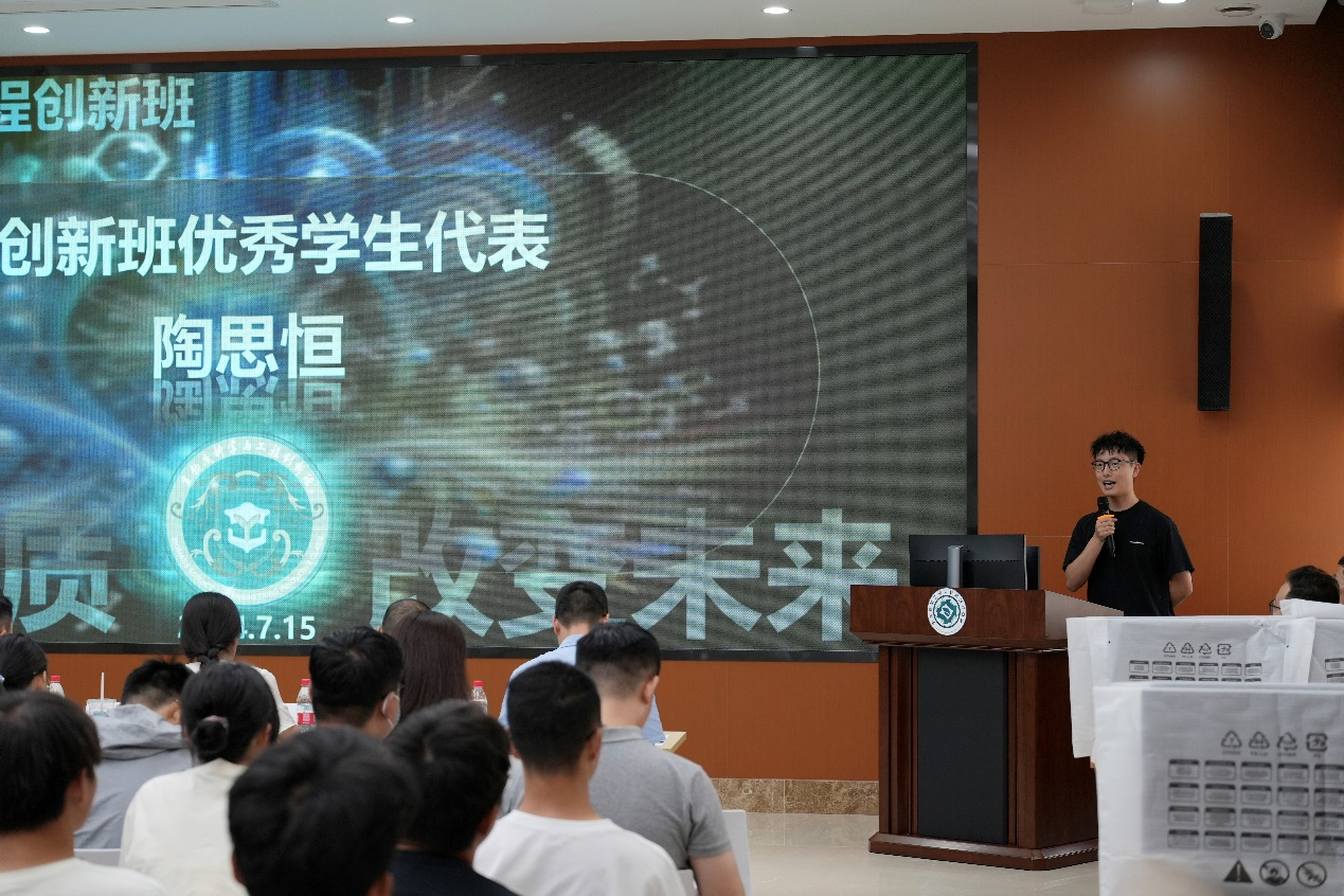 在接下来的环节中�2023级创新班新生代表陈俊昊以及教师代表张伟华特聘研究员相继发言,他们分别从学生与教师的角度表达了对创新班未来发展的期待与信心�