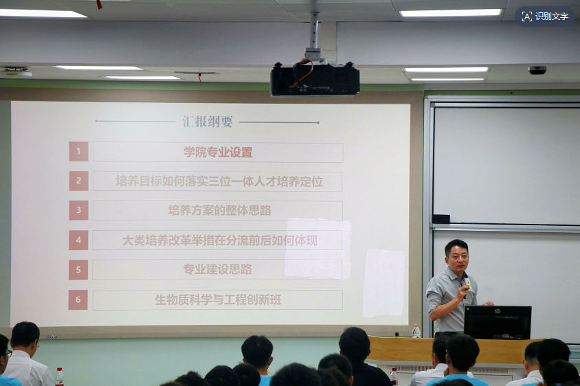 紧接着,教学副院长陈意教授就学院学科设置、人才培养、专业建设等方面�2024级同学开展全面介绍。“希望我们的学生在行业内能独当一面”陈院长如是说道。陈院长指出,我院秉持学校强基础、厚通识、宽视野、多交叉的培养特色,努力做到传承与变革融合、传统与创新互鉴的发展导向。同时,陈院长深入浅出而又简明扼要地介绍了我院轻化工程、食品科学与工程、生物工程三大工科专业,并就石碧院士领衔的生物质科学与工程创新班向同学们进行推介�