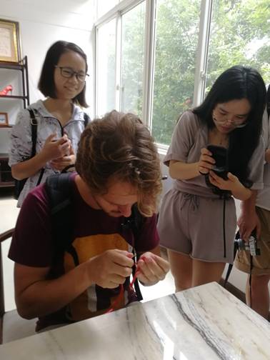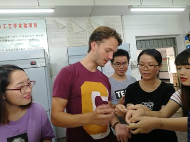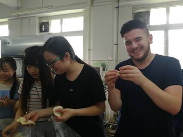 同学们邀请来自荷兰万豪劳伦斯大学的 Jitske Andrea Land老师和国际交流营的八名留学生在纺工楼一楼食品罐藏实验室制作饺子,在食品烘焙实验室制作寿司。