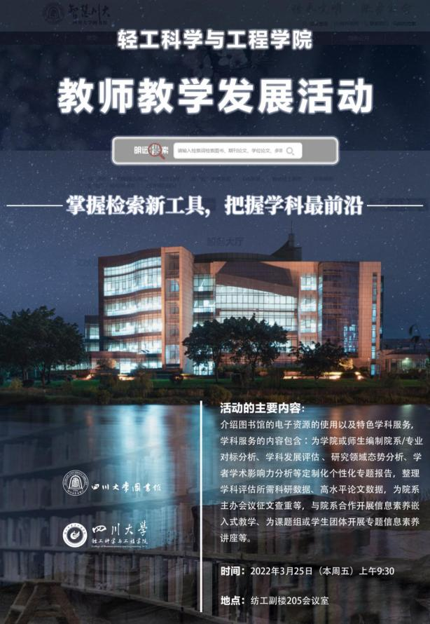 为促进教师教学发展,帮助教师掌握检索新工具,充分利用我校图书馆馆藏资源,提升信息素养,从而把握学科前沿,我院联合四川大学图书馆,�2022325日在四川大学望江校区纺工附楼205会议室开展了主题�“图情服务进学院”的教师教学发展活动�