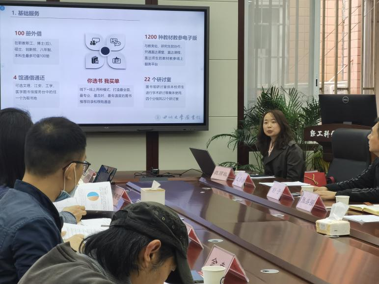 随后�张盛强副馆长介绍了四川大学图书馆在互联网时代,工作服务重心发生了巨大的变化,充分利用网络平台做好信息服务。在图书借阅等传统的基础服务之外,愈加重视数字期刊、数字图书等线上资源的建设与服务。服务形式包含特设课程、知识讲座、嵌入式教学等,力争做到全覆盖服务及知识宣传。此外,王副馆长还介绍了学科服务这一特色板块,针对需求开展学科分析报告等,并表明校图书馆将利用馆藏资源、人力资源优势,做好信息服务�