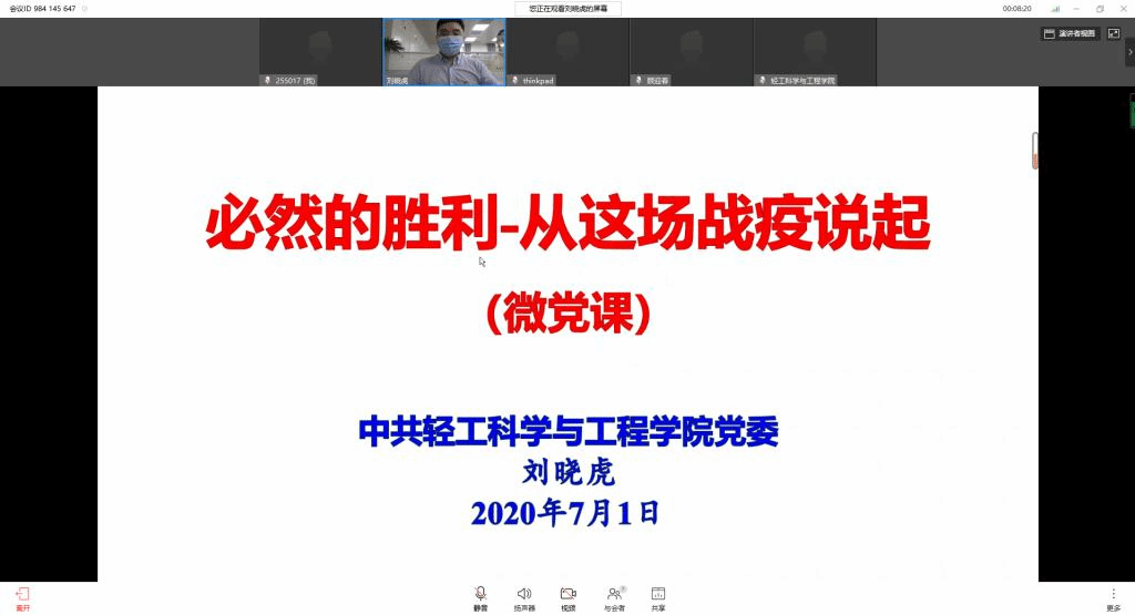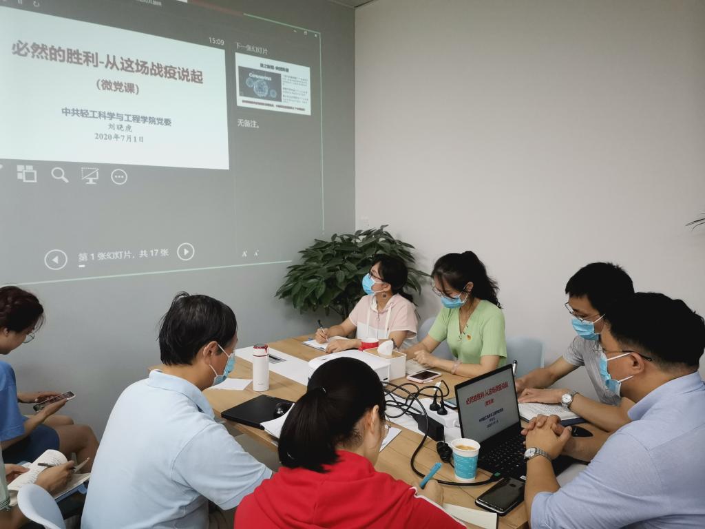 为全面贯彻落实党中央和校院关于常态化疫情防控的决策部署,充分发挥学院各党支部的战斗堡垒作用和师生党员的先锋模范作用,让党旗始终高高飘扬在疫情防控、返校复学、事业发展的全过程,值此纪念建党99周年之际,按照教育部和学校党委关于认真组织开展“四个一”行动的的相关要求,7月1日下午,学院党委书记刘晓虎同志在纺工附楼204会议室讲授了一堂题为《必然的胜利—从这场战疫说起》的专题微党课。微党课采取线上线下相结合的方式进行,学院院长、党委副书记、科级干部在现场参会,其他党委委员、教职工党支部书记在线上参会。