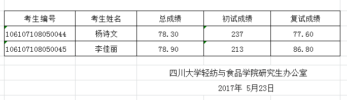 现将轻纺与食品学院2017年博士研究生招生入学成绩进行公示。如有问题或意见,自公示之日起十个工作日内,实名制反映至轻纺与食品学院纪委办公室。邮箱[email protected],联系电话85461730。此名单不包括非公开招考考生。
