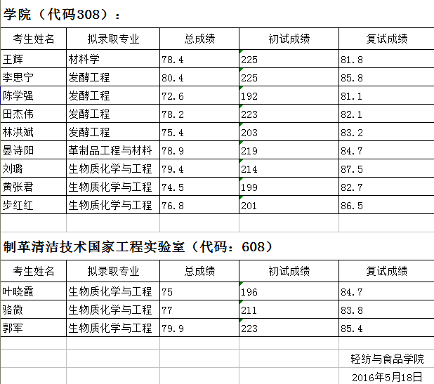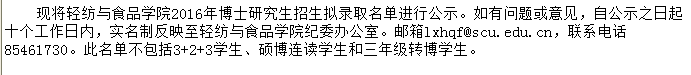 轻纺与学院2016年博士研究生招生拟录取名单公示