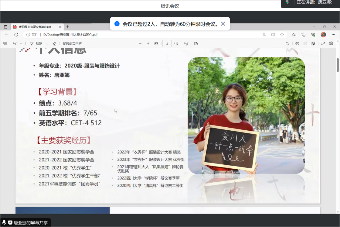 服装与服饰设计系通过腾讯会议在线平台顺利开展了2023年优秀大学生暑期夏令营活动。参加本次活动的人员有服装与服饰设计系主任杨璐铭教授、副主任申鸿副教授、教研室主任刘健西老师,本科生马裕宁、唐亚娜。