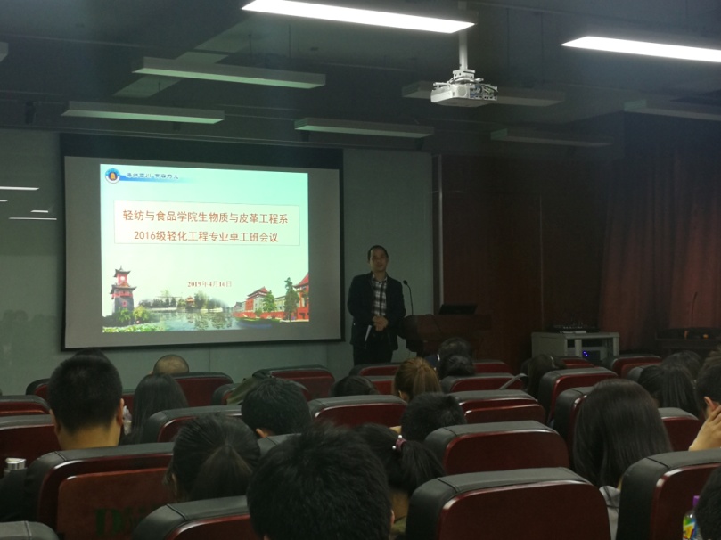 轻化工程专业2016级全体本科生、轻纺与食品学院院长何有节教授、皮革系副系主任程海明教授、皮革系副系主任周建飞教授、皮革工程方向教研室主任但年华副教授、2016级辅导员王舒灏老师等参加了动员会。