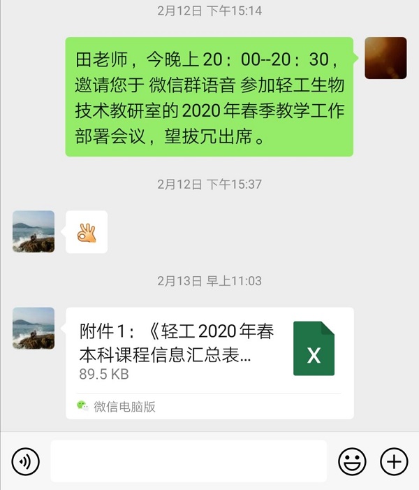为更好地开展新学期教学工作,2020年2月12日20:00轻工生物技术教研室利用微信语音召开了新学期教学工作安排交流会,教研室所有任课教师出席会议,会议由教研室主任周荣清老师主持。