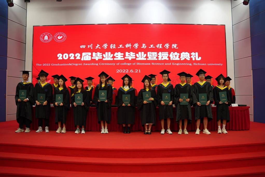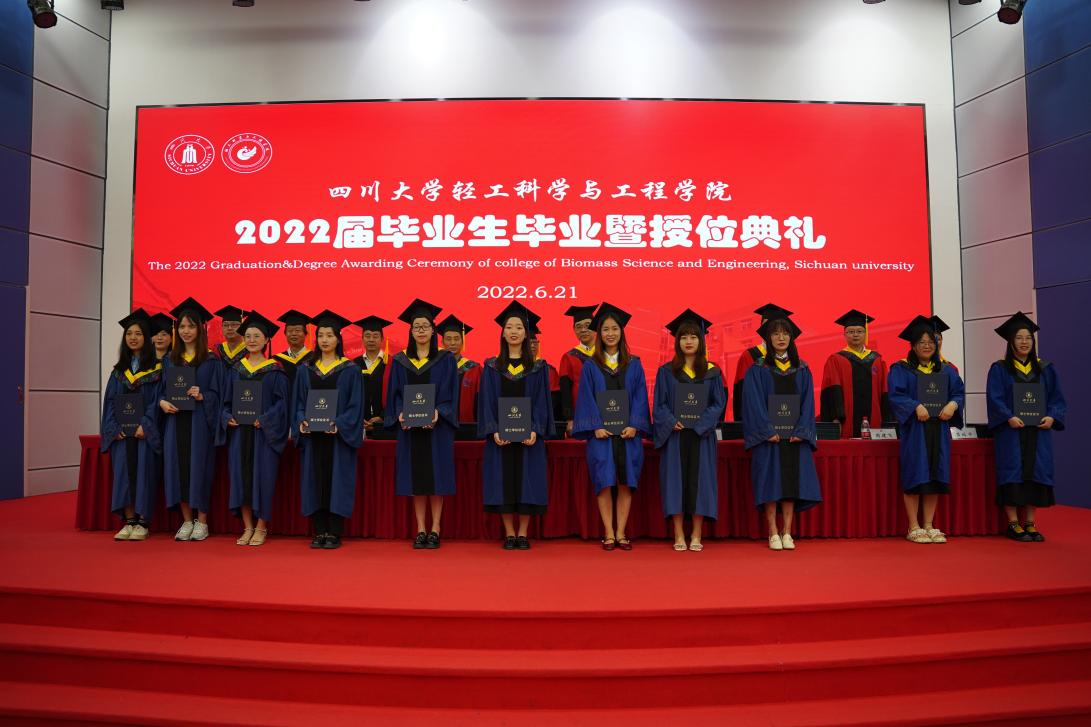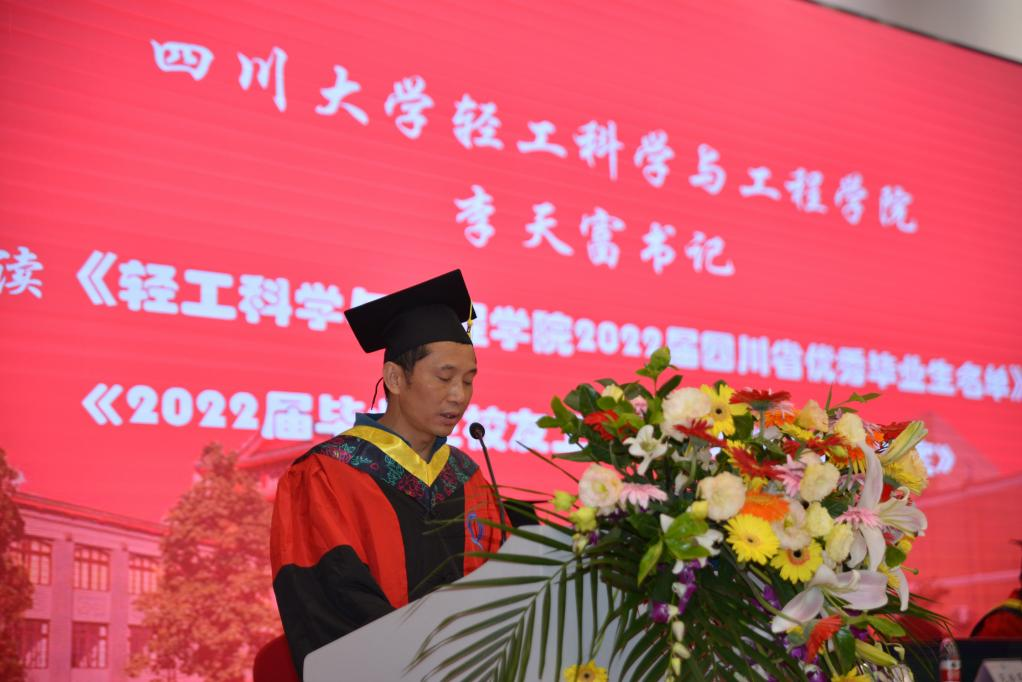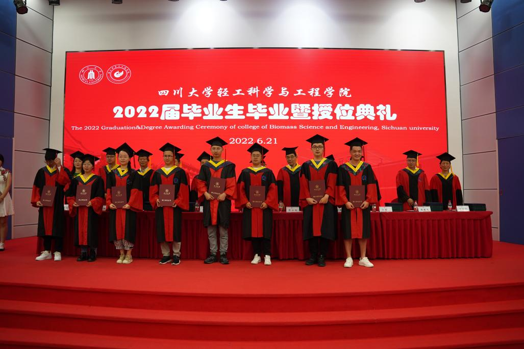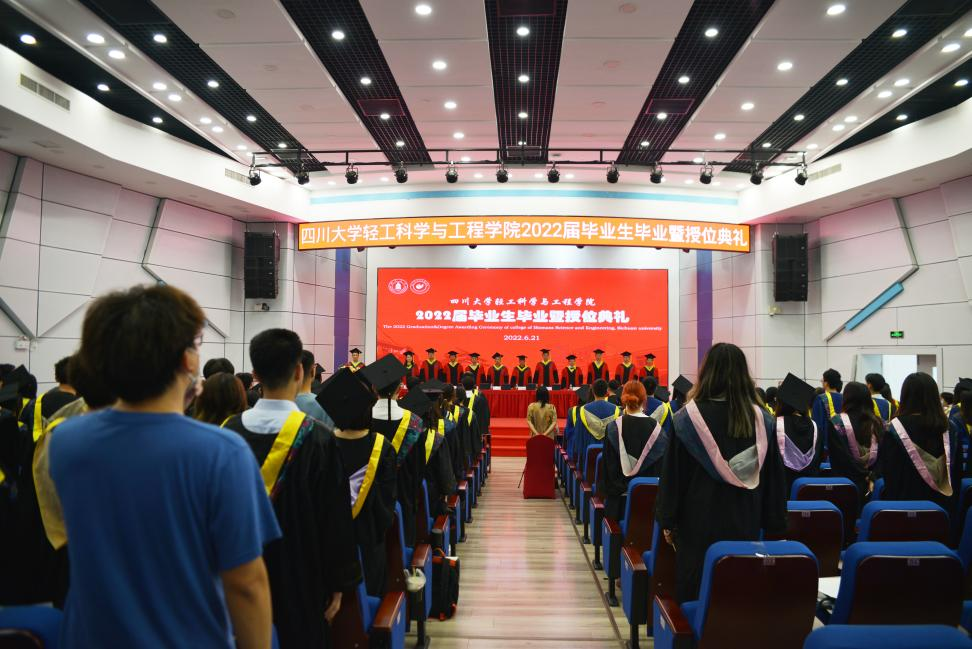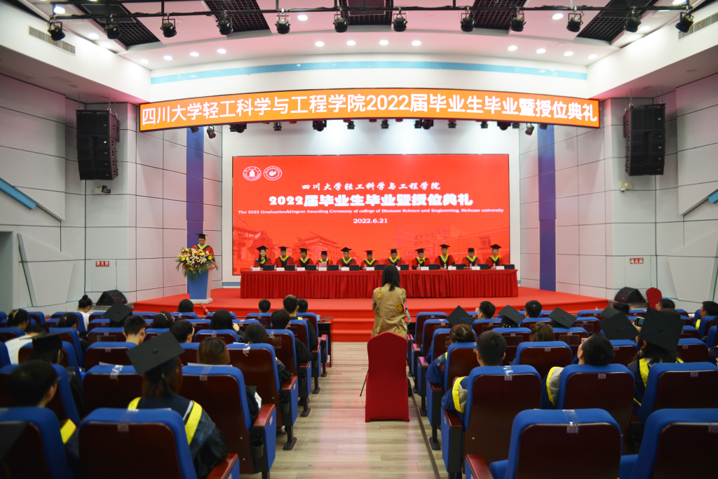 2022�6�21日上午,四川大学轻工科学与工程学�2022届毕业生毕业暨授位典礼在东三教演播厅隆重举行。学院教授委员会副主任杜宗良教授,学院党委李天富书记,学院学位评定分委员会委员、教授委员会委员彭必雨教授、范浩军教授、周荣清教授、何有节教授、兰建武教授、田永强教授、周建飞教授、吕远平教授、杨璐铭教授出席典礼并在主席台就座。学院教师代表�2022届毕业生家长代表、校友代表、在校生代表以及2022届全体毕业生参加了典礼。本次典礼由学院党委冯国涛副书记主持�