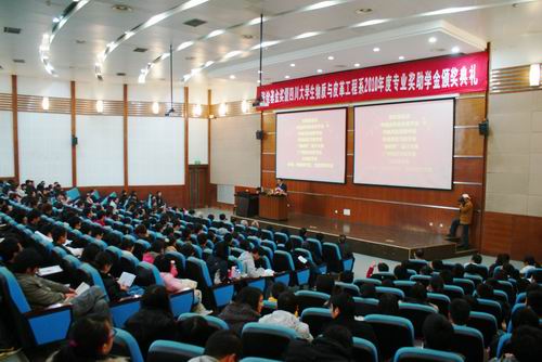 生物质与皮革工程系2010年度专业奖助学金获奖名单。在隆重的颁奖音乐中,学院领导及企业代表为获奖同学颁发了证书并合影留念。最后,轻纺与食品学院2008级本科生获奖同学代表杨飞发表了获奖感言,她表示今后会更加努力,用自己的实际行动来回馈企业以及社会各界对AV研究所