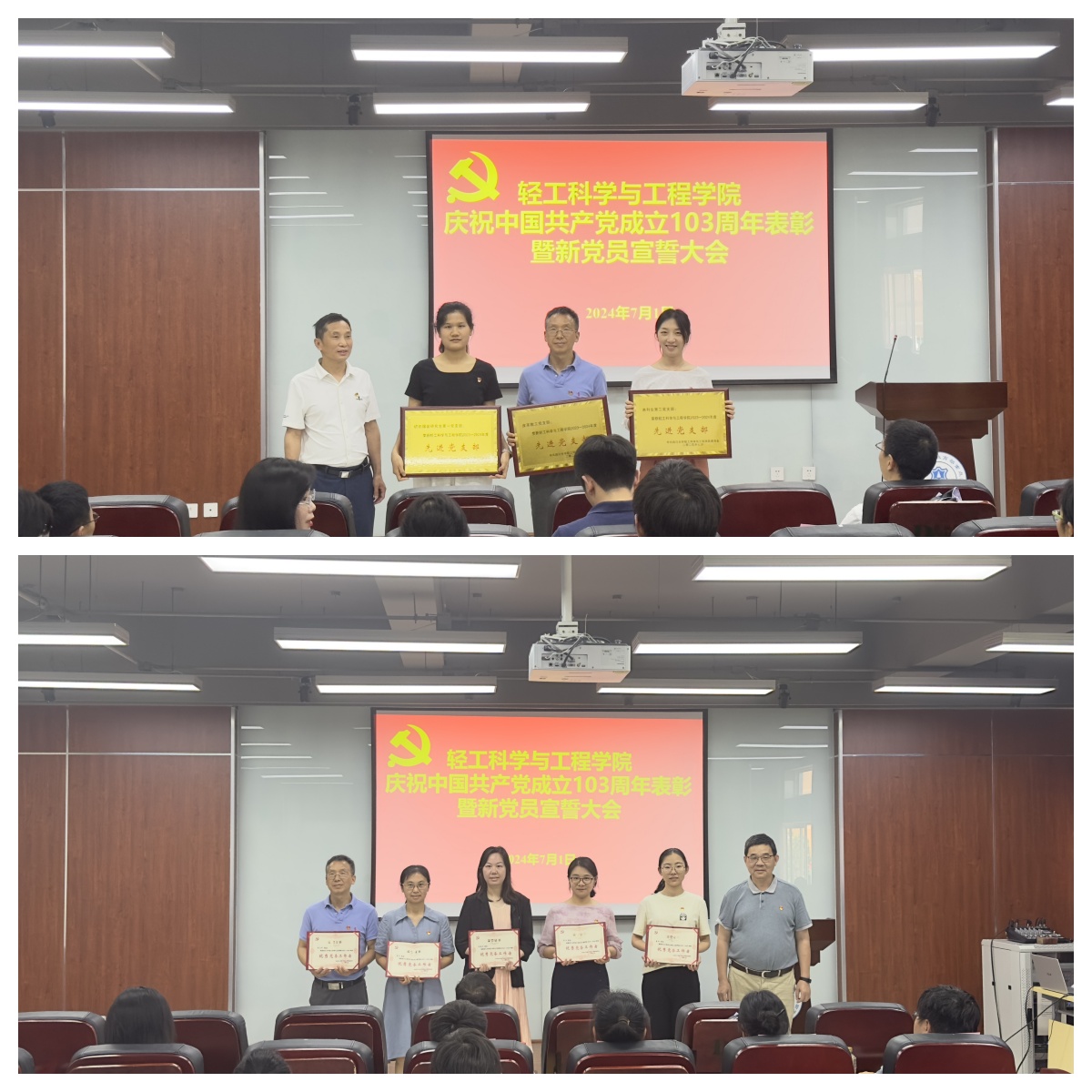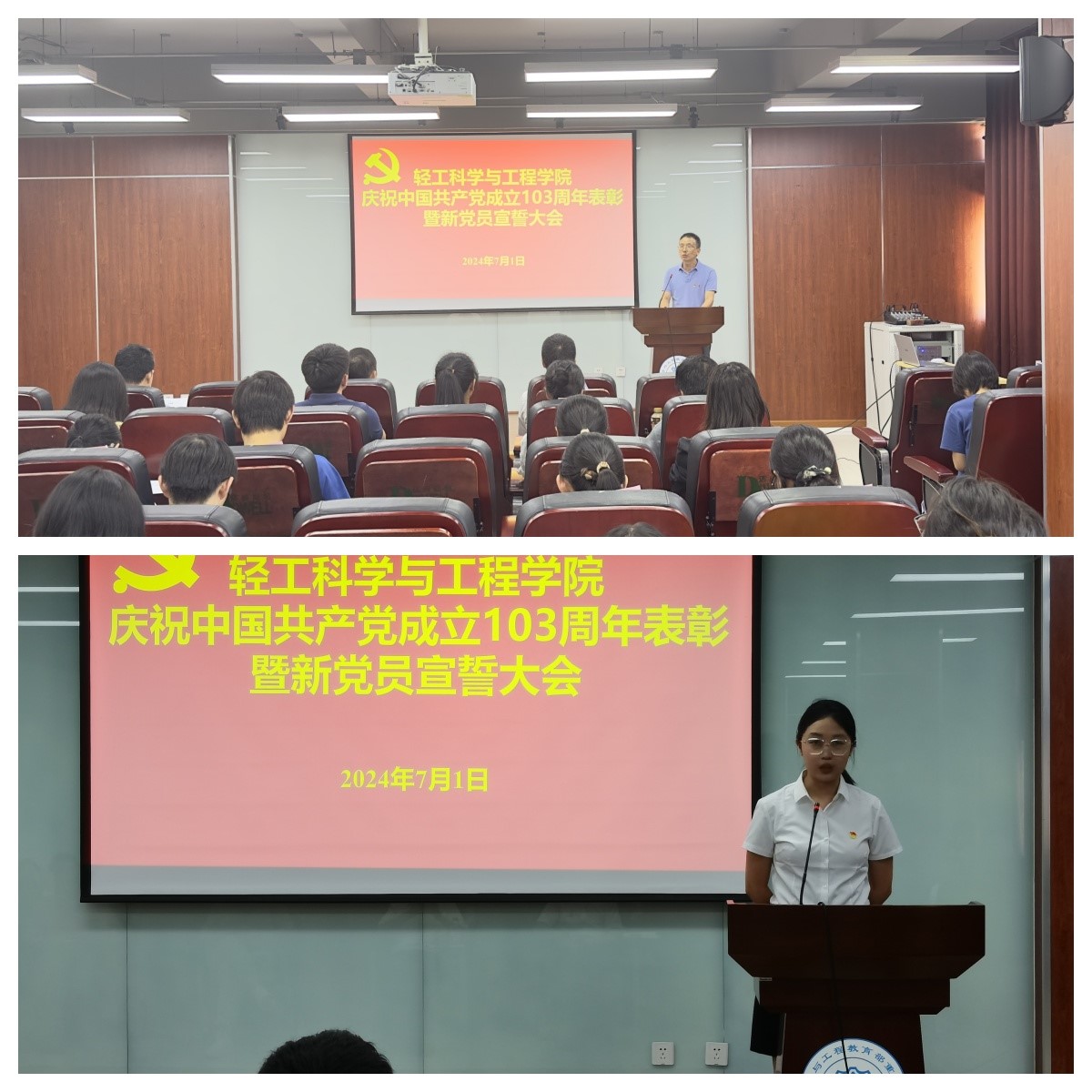 2024年7月1日下午,学院在皮革楼215报告厅隆重举行庆祝建党103周年表彰暨党员宣誓大会。学院班子成员、两委委员、支部代表、获奖支部、个人及新发展党员代表参加本次会议。会议由彭必雨院长主持。